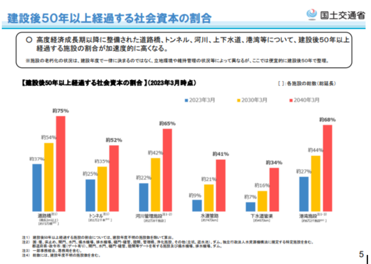 国土交通省のデータでも道路橋や上下水道など建設後50年以上経過するインフラが急増していることが示されています。