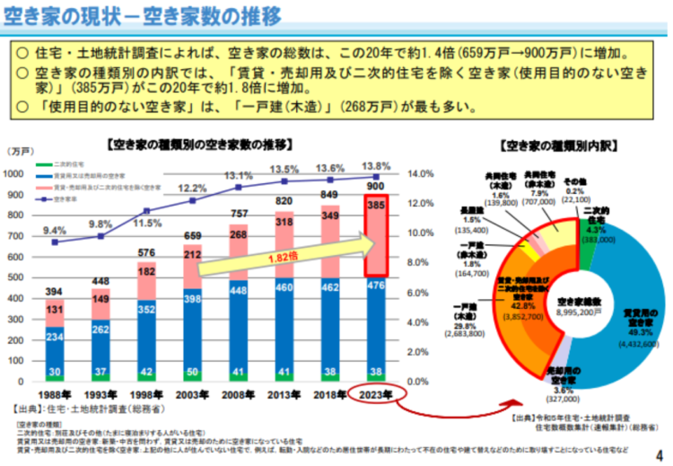 国土交通省によると、国内の空き家数が1988年の394万戸から2023には900万戸(2023)へ増加しています。特に地方では放置される住宅が増え続けており、空き家の増加が一時的な現象ではなく、今後も続く可能性が高いです。