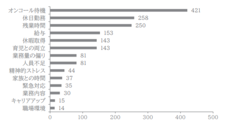 病院勤務の臨床工学技士は、仕事の不満として「オンコール待機」「休日勤務」「残業時間」「給与」などを多く挙げており、特に時間的拘束の強さが大きな負担になっています。