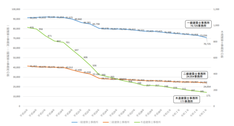 建築士事務所数の推移を見ると、全国で数万拠点の事務所が長年高い水準で並び、都市部では1つの都府県内だけで数千事務所が競合する状態が続いています。
