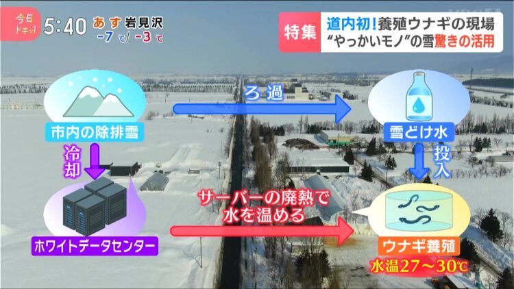 除雪によって集まる雪を溶かし、その水をウナギの養殖水に使用、隣接するホワイトデータセンターのサーバーから出る廃熱を利用して水の温度を保っています。