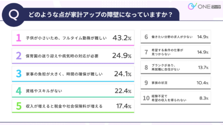 出典:PRTIMES「【ONEマーケ、主婦の副業・節約意識調査を実施】約7割以上の主婦が育児と仕事の両立に課題を感じている結果に。キーワードは「家計ちょい足し」」