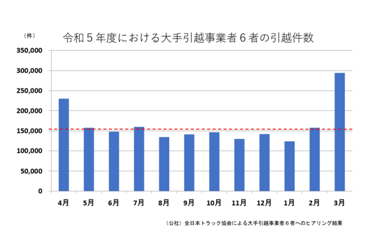 国土交通省「令和5年度における大手引越事業者6者の引越件数」によると、3月中旬〜4月初旬がピーク期間で、引越件数は通常月の約2倍に達します。