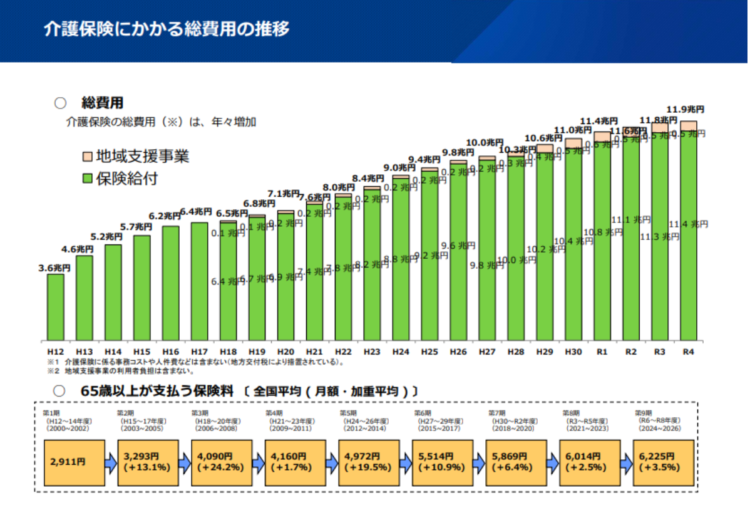 さらに、介護保険にかかる総費用が2000年の3.6兆円から令和4年には11兆円台へと継続的に増加しています。
