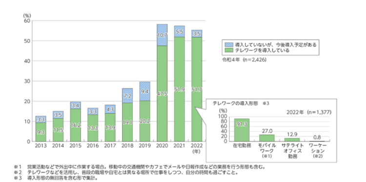 グラフを見ると、2019年時点では約3割(導入20.2%)だったテレワーク実施率は、2022年には51.7%へと急増し、企業の半数以上が導入する働き方へと変化しました。