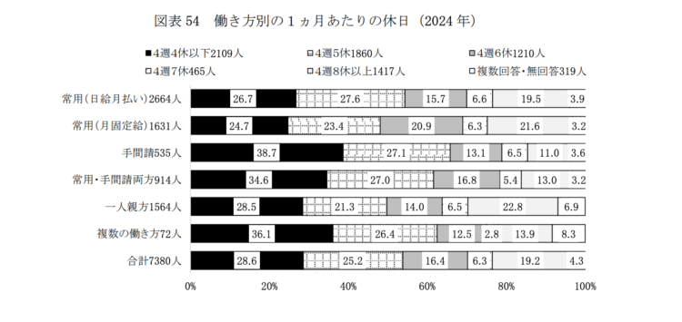 手間請の約65.8%が「4週5休以下」で働いており、一人親方は49.8%にとどまっています。