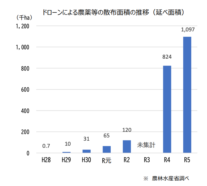 農林水産省のデータによると、ドローンによる農薬散布面積は令和5年度に100万haを突破しました。