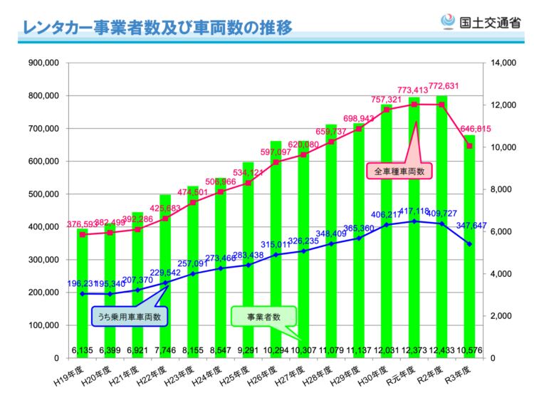 国土交通省の統計によると、レンタカービジネスの車両数は長期的に右肩上がりで推移しており、全車種・乗用車ともに増加傾向が続いています。