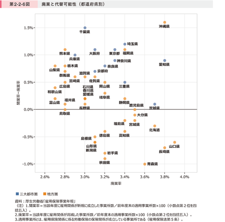 データでは、地域別の開廃業率の差が鮮明に描かれており、三大都市圏は開業率が高いものの、競争に敗れて消滅する組織も少なくありません。