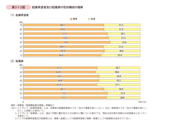 グラフは起業家の性別構成を示したものですが、女性の起業家がコンスタントに約3割存在しており、起業が性別を問わず開かれた選択肢であることを示しています。